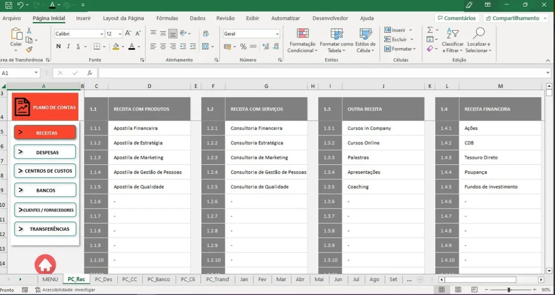 -Plano de Contas: Registre os grupos de receitas e despesas.