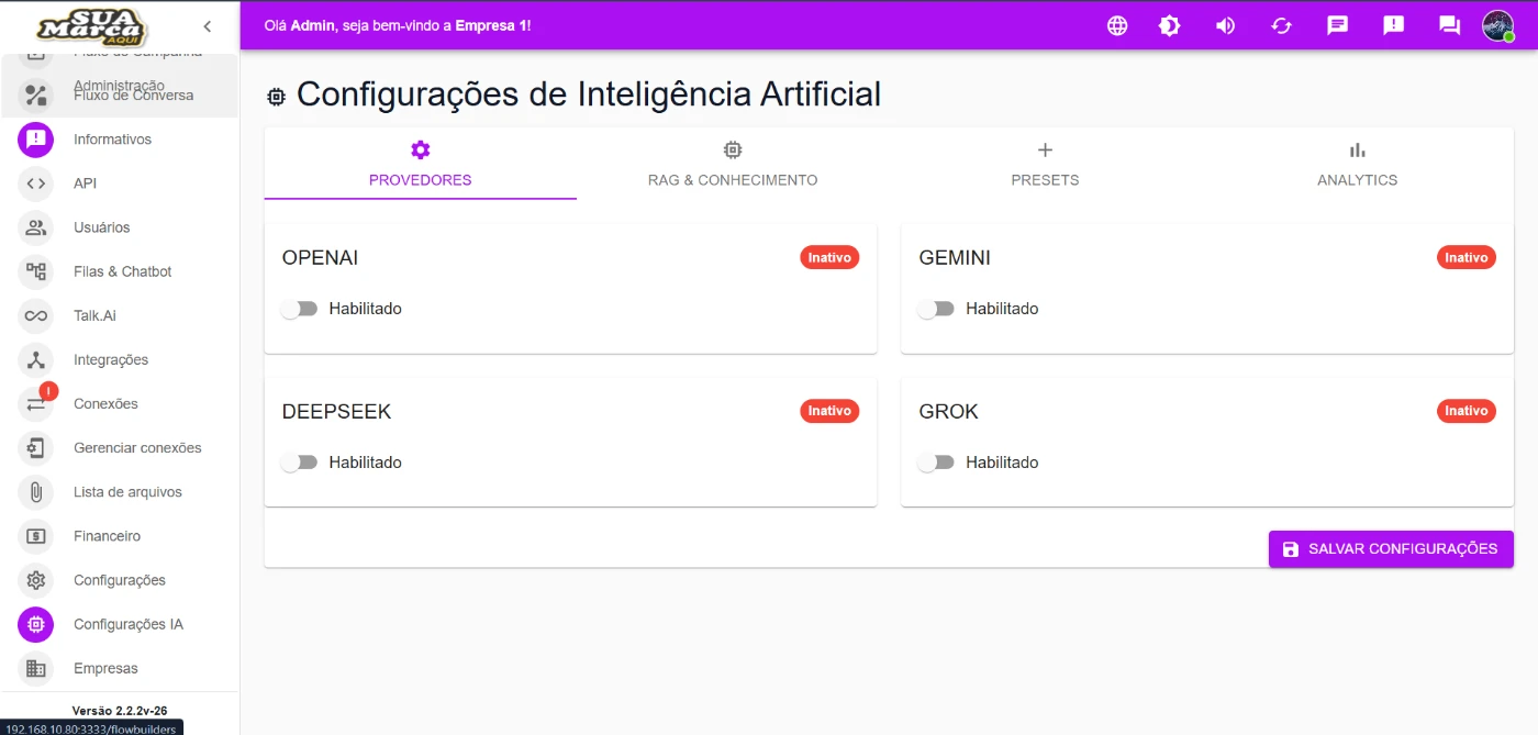 Crie fluxos inteligentes com perguntas, condições e integração direta com Typebot, OpenAI ou Gemini.