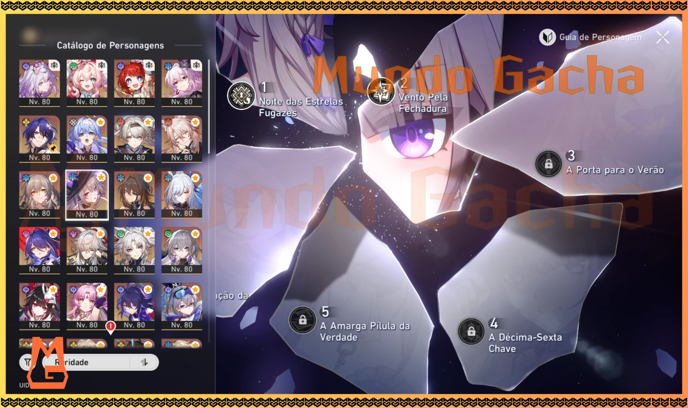 ►Personagem 5✯: E3 SPARKLE + E2 DAN HENG EL + E1 RUAN MEI + CYRENE + CASTORICE + TRIBBIE + HYACINE + ACHERON + A HERTA + FEIXIAO + RAPPA + BOOTHILL + VAGA-LUME + ROBIN + AVENTURINE + CISNE NEGRO + KAFKA + ARGENTI + TOPAZ + JING YUAN + FU XUAN + LOBA PRATEADA + JINGLIU + BLADE + LUOCHA + DAN HENG PT + DR. RATIO + ARCHER + E5 BAILU + E3 CLARA + E2 WELT + E3 YANQING + E1 HIMEKO + E1 GEPARD + BRONYA