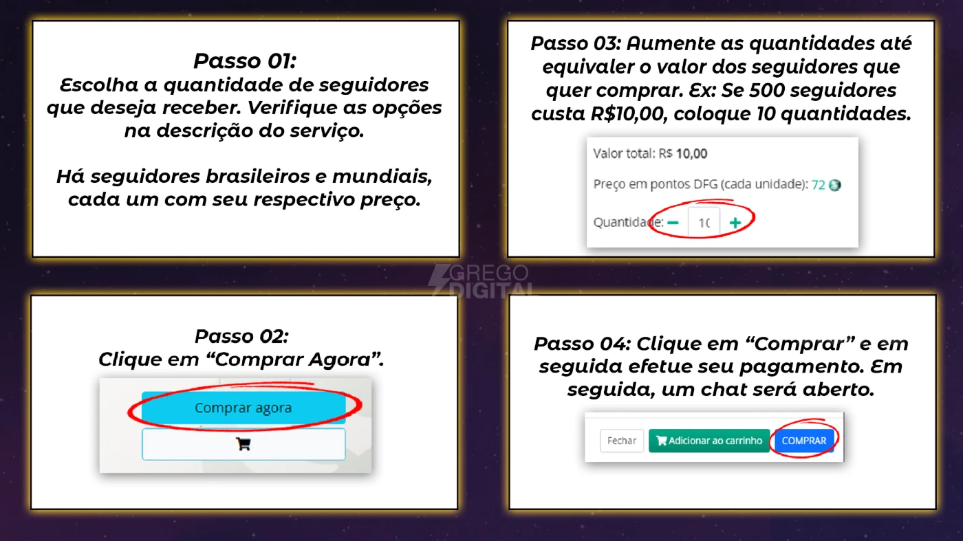 Por lá, você vai nos informar se comprou Seguidores Estrangeiros ou Brasileiros. E, em seguida, você vai nos informar o LINK DO SEU PERFIL!