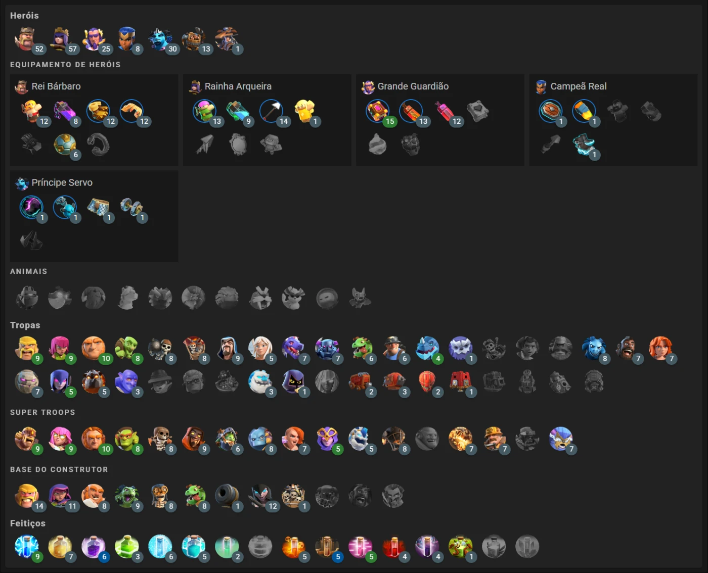 | 🔹LVL Heróis: Rei: 52 / Rainha: 57 / Servo: 30 / Guardião: 25 / Campeã: 7. |