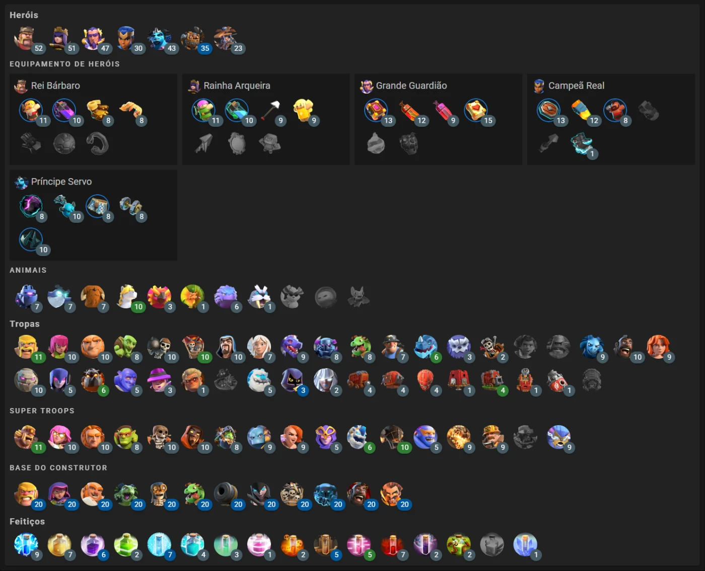 🔹LVL Heróis: Rei: 52 / Rainha: 51 / Servo: 43 / Guardião: 47 / Campeã: 30.