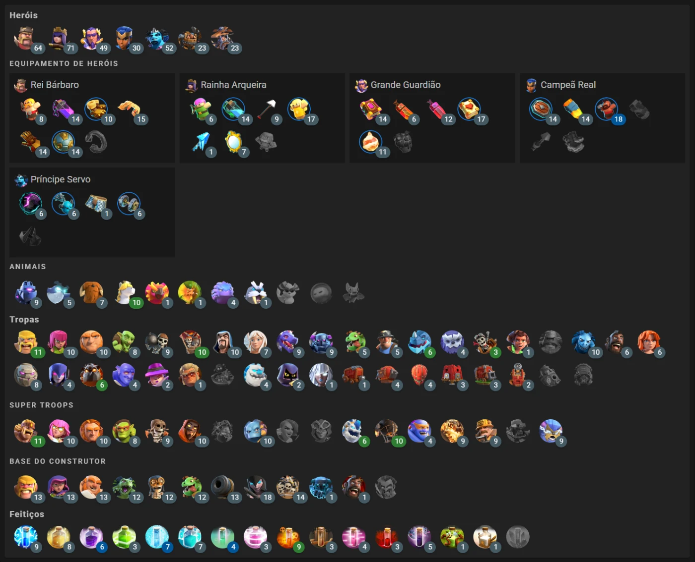 | 🔹LVL Heróis: Rei: 64 / Rainha: 71 / Servo: 52 / Guardião: 49 / Campeã: 30. |