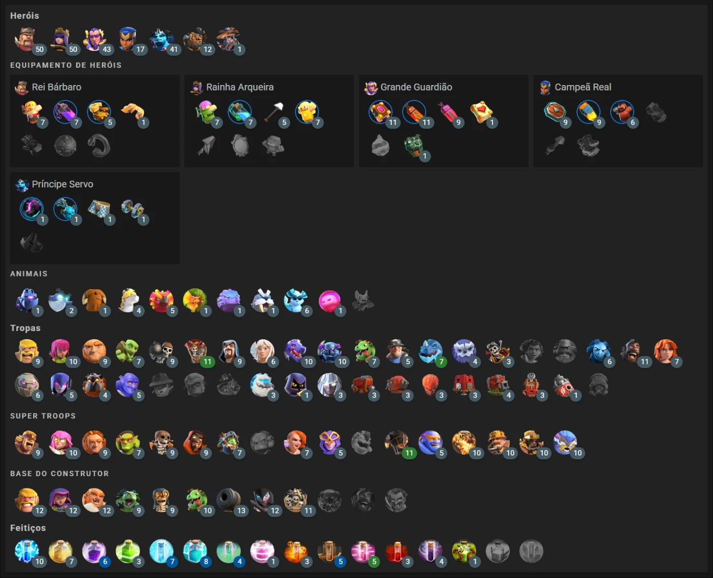 | 🔹LVL Heróis: Rei: 50 / Rainha: 50 / Servo: 41 / Guardião: 43 / Campeã: 17. |