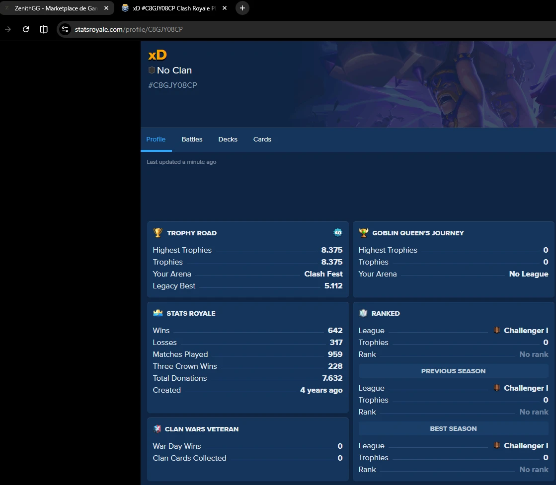 Vantagem: Ótima taxa de vitória (642 vitórias / 317 derrotas) e mais de 7.600 doações. Sem clã no momento, pronta para transferência.