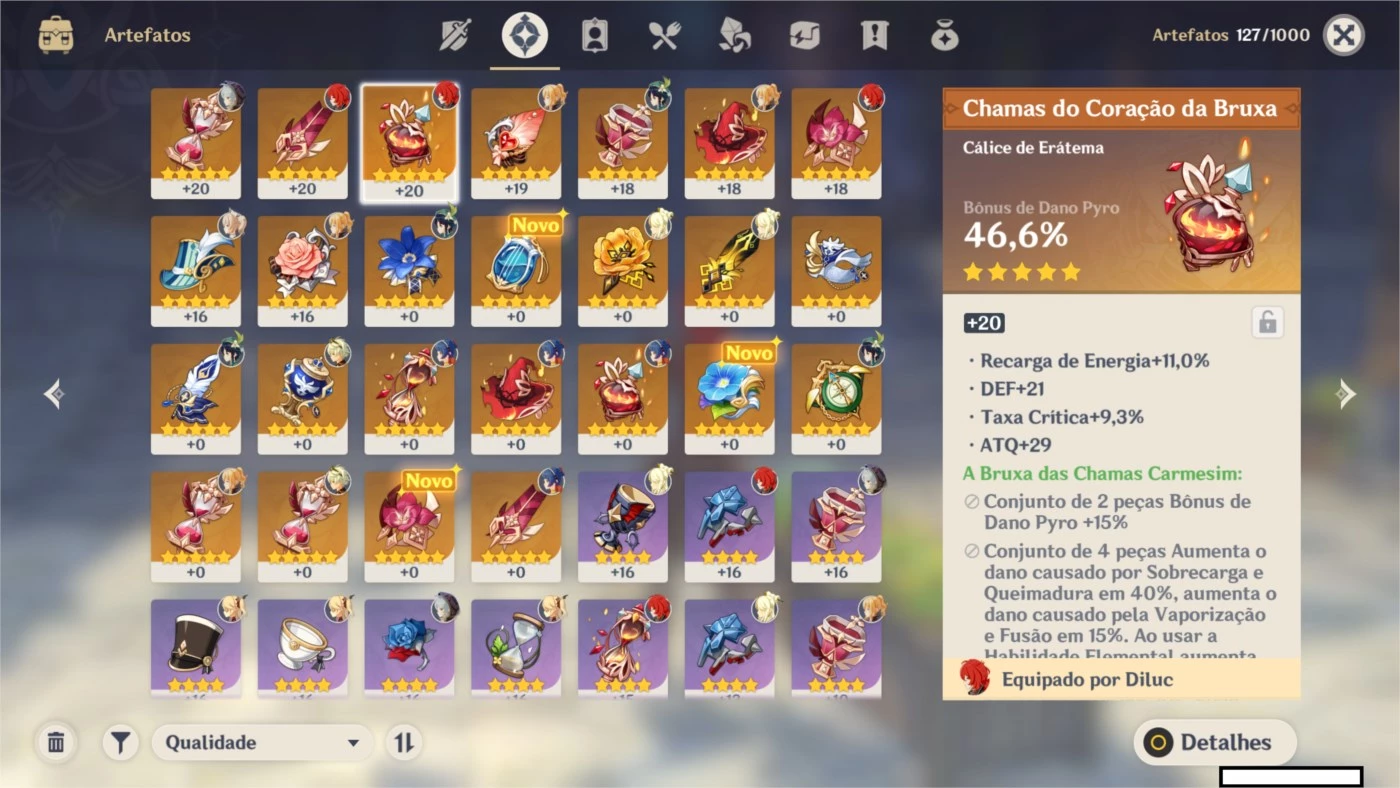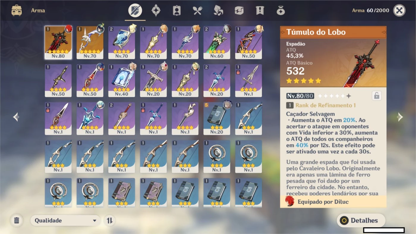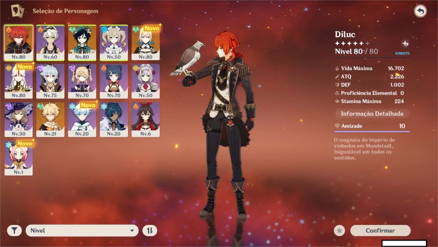 AR 48 Diluc + Tumulo do Lobo + Venti + Jean + Benção - Genshin Impact