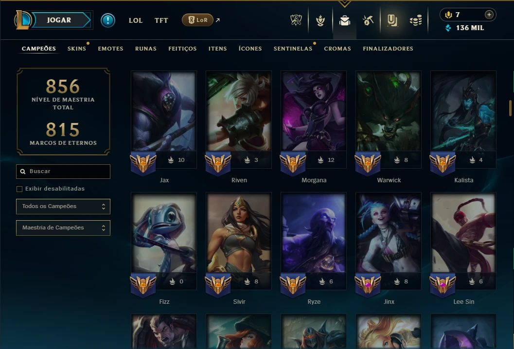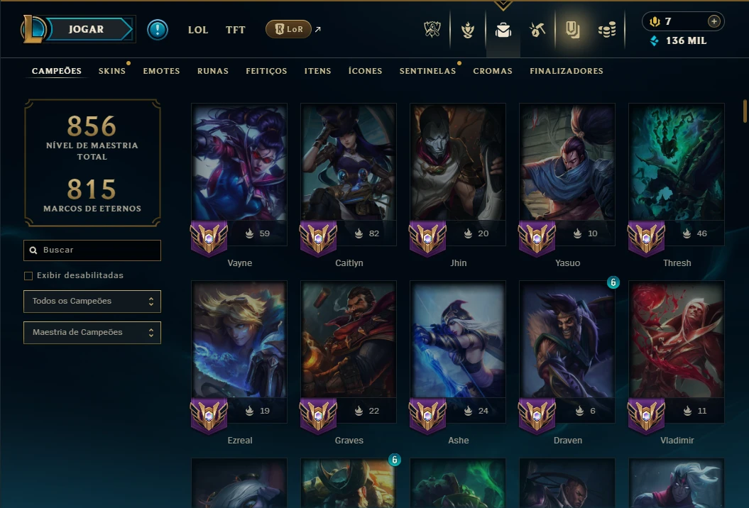 ( MAIN ADC ) - Conta Ouro 1 com TODOS os Champs, Maestria 41 de Vayne, 24 de Caitlyn, 17 de Jhin, 45 Maestrias acima de 7, 457 Skins, 3 Ultimates, 5 Miticas, 2 Prestigios: Jax e Katarina, 12 Vitoriosas, 136k de EA, 41 Cromas, 336 Ícones, 196 Emotes, 39 Essencias Miticas, 3 Reembolsos e Honra 3.