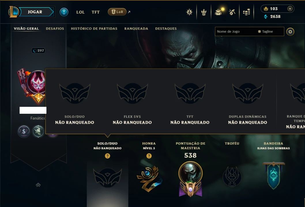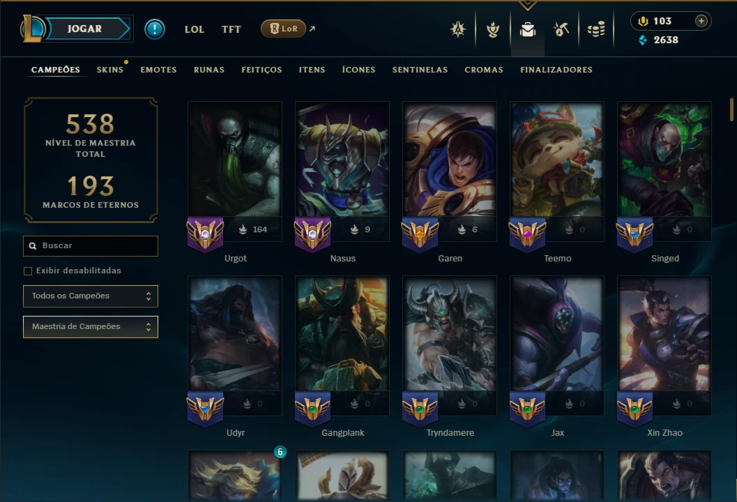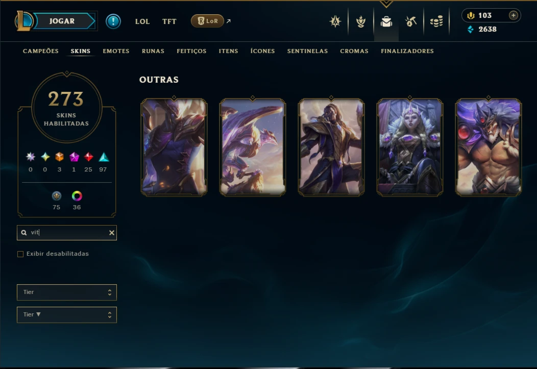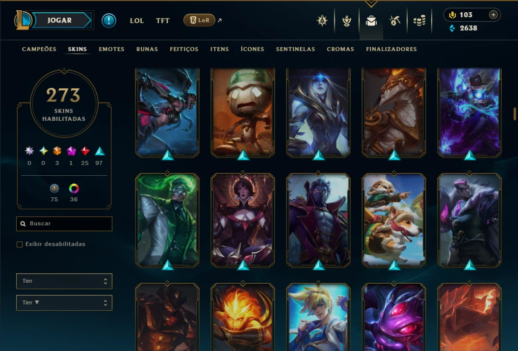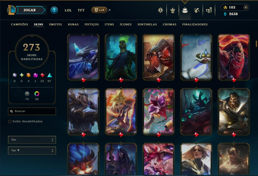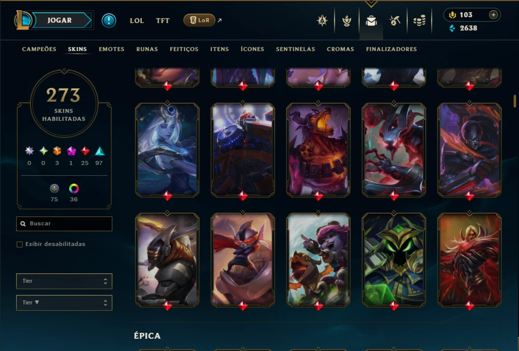 Conta Unranked com TODOS os Champs, 273 Skins, 3 Ultimates, 5 Vitoriosas, 39 Cromas, 246 Ícones, 163 Emotes, 70 Fragmentos de campeão, 1 de Skin, 3 Reembolsos e Honra 3.