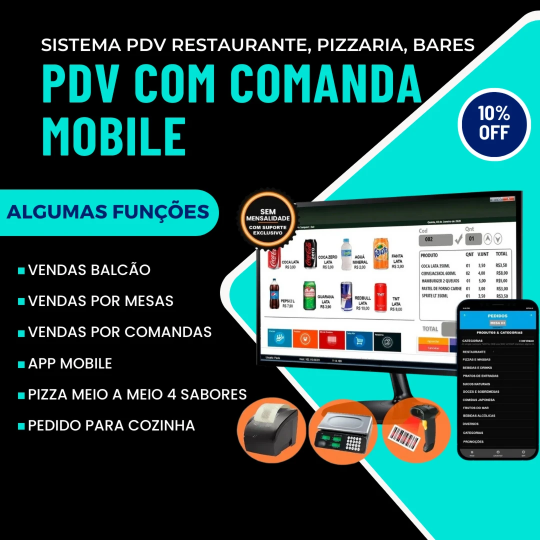 Rápida instalação, Suporte via [conteúdo removido] app. Possui comanda mobile, app para o garçom ou atendente efetuar pedidos por celular ou tablet direto da mesa do cliente enviando para impressoras e cozinha.
