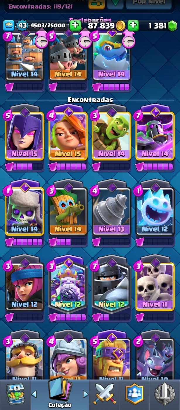 Ela inclui 6 cartas nível 14, 2 cartas Elite, além de 7 evoluções liberadas. A conta também possui 1.381 gemas, ideal para comprar Pass Royale, torneios, ofertas e progredir muito mais rápido.