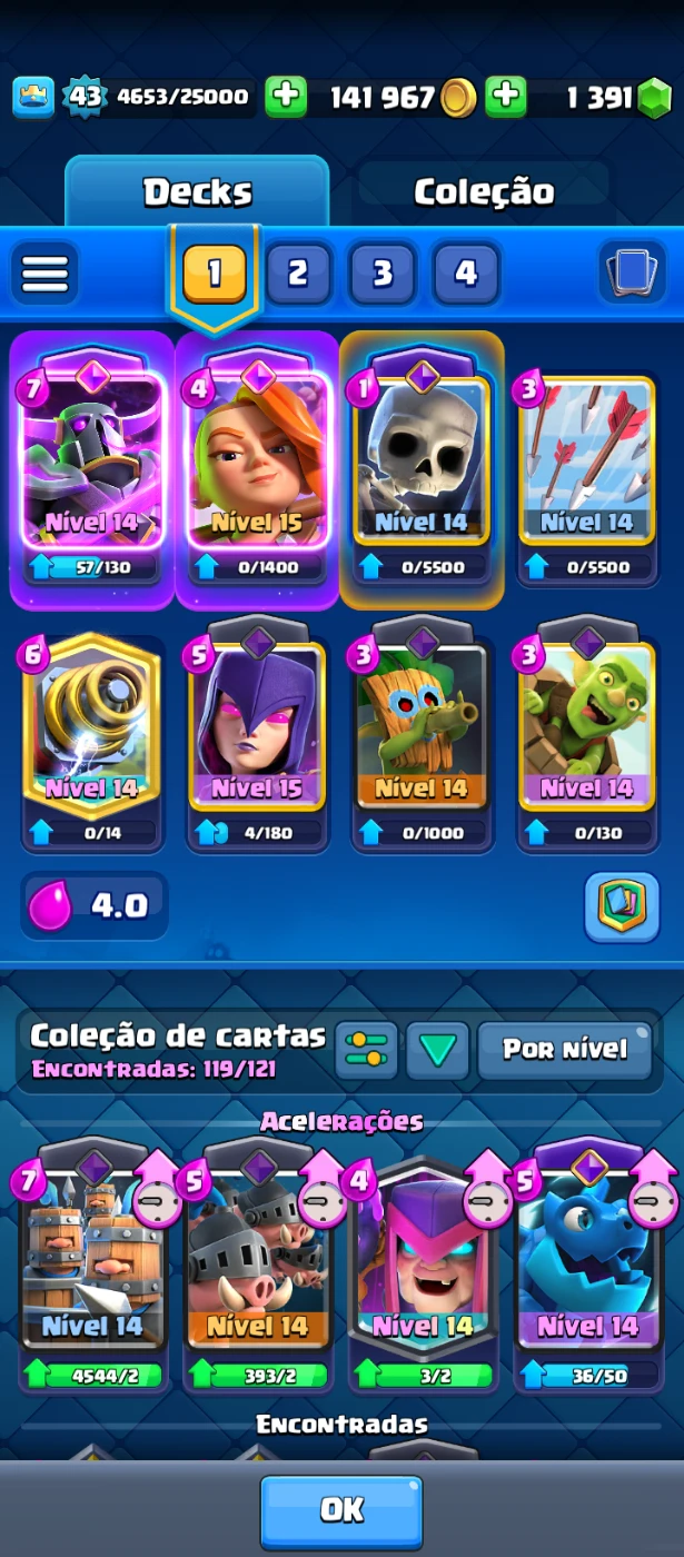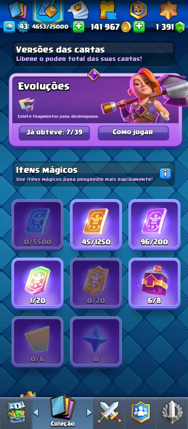 Ela inclui 6 cartas nível 14, 2 cartas Elite, além de 7 evoluções liberadas. A conta também possui 1.381 gemas, ideal para comprar Pass Royale, torneios, ofertas e progredir muito mais rápido.