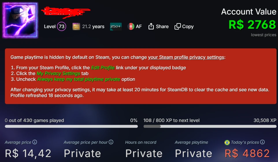 Steam 21 anos | Lvl 73 | 342 Jogos - Counter Strike CS