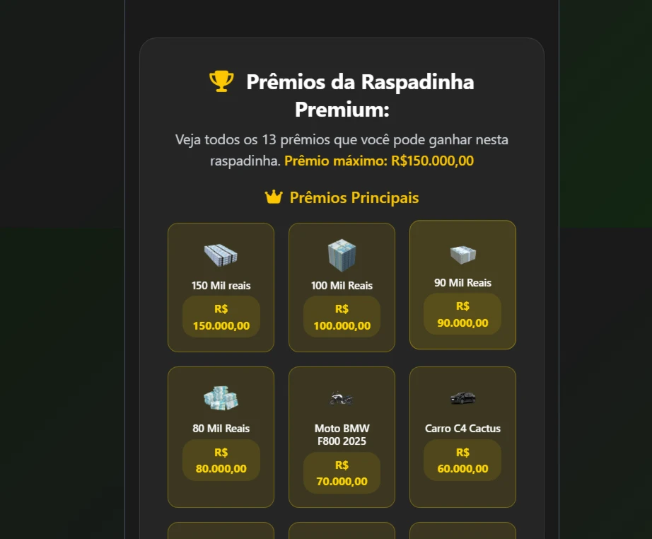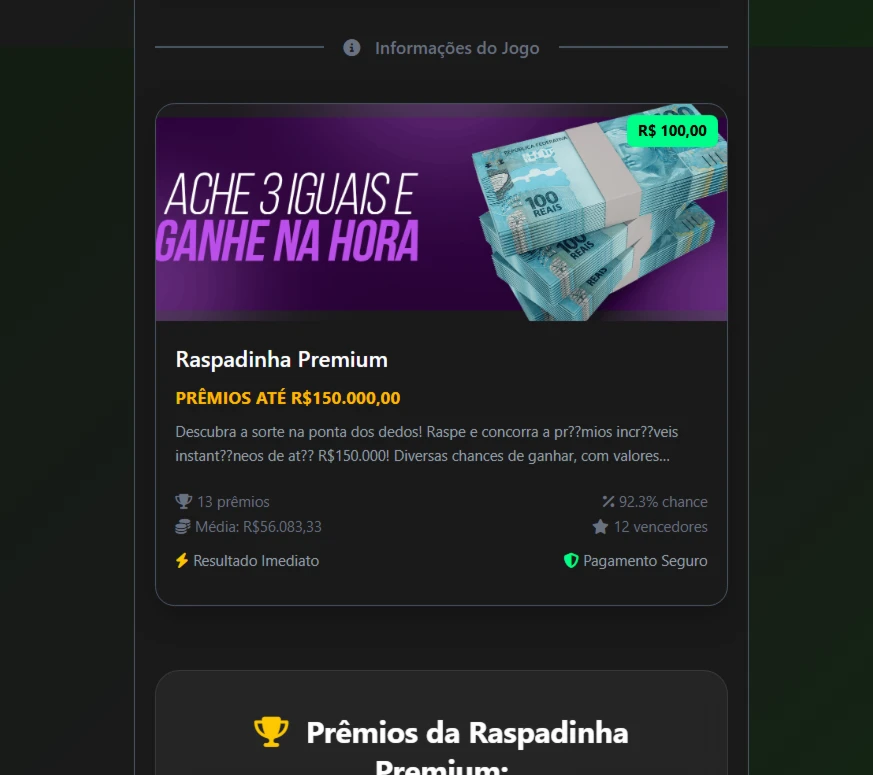 ✅ Raspadinhas Interativas: Grade 3x3 com mecânica realística.