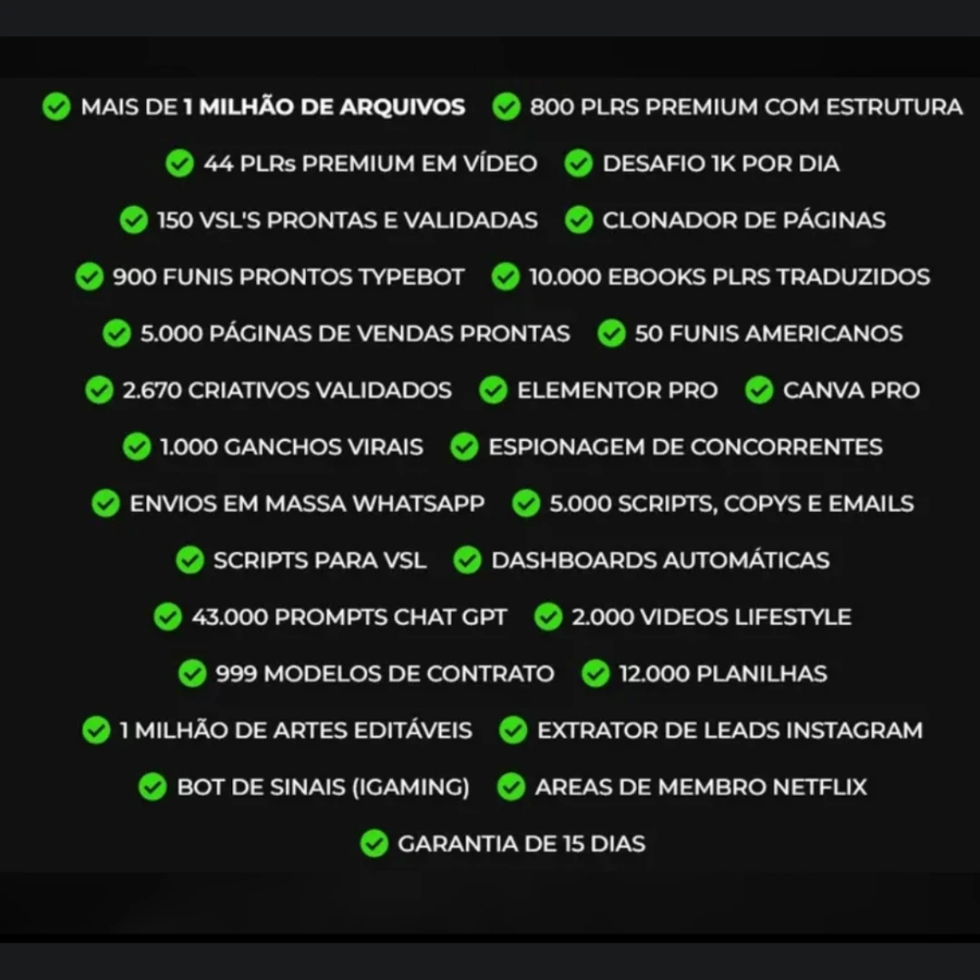 Com este pacote, você terá acesso a mais de 1 milhão de arquivos, incluindo 800 PLRs premium com estrutura, 44 PLRs premium em vídeo, 150 VSL's prontas e validadas, 900 funis prontos Typebot e 10.000 ebooks PLRs traduzidos. Além disso, você contará com 5.000 páginas de vendas prontas, 50 funis americanos, 2.670 criativos validados, Elementor Pro, Canva Pro, 1.000 ganchos virais, espionagem de concorrentes, envios em massa [content removed] App, 5.000 scripts, copys e emails, scripts para VSL, dashboards automáticas, 43.000 prompts Chat GPT, 2.000 vídeos lifestyle, 999 modelos de contrato, 12.000 planilhas, 1 milhão de artes editáveis, extrator de leads Instagram, bot de sinais (iGaming) entre outros.