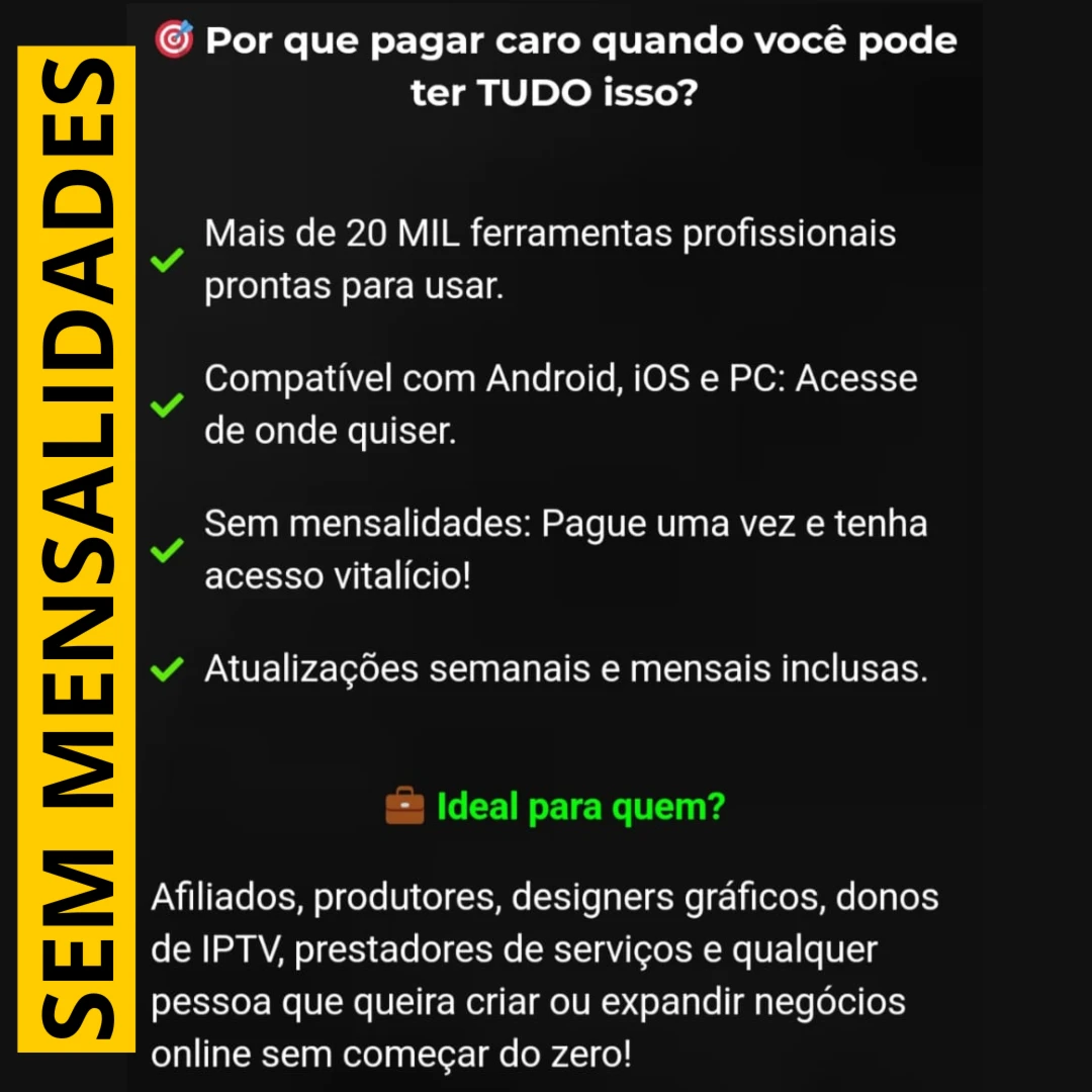 E o melhor de tudo: tudo isso por um preço único de R$10,90, sem mensalidades! Sim, você ouviu direito. Essa é a sua chance de adquirir ferramentas essenciais sem preocupações com pagamentos recorrentes.