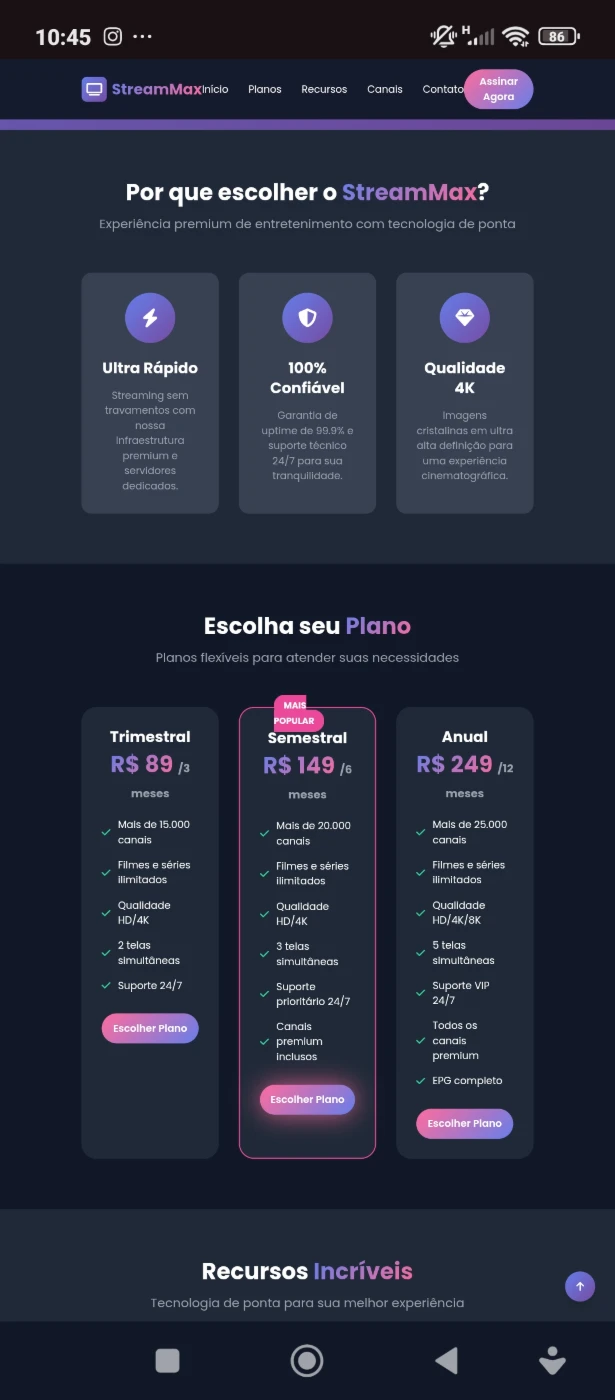 Apresente sua marca com um site profissional, moderno e totalmente responsivo, desenvolvido com design premium e pensado para converter visitantes em clientes. Esse script foi criado para quem deseja oferecer serviços digitais, assinaturas, planos ou até mesmo montar seu próprio negócio de streaming/entretenimento online.