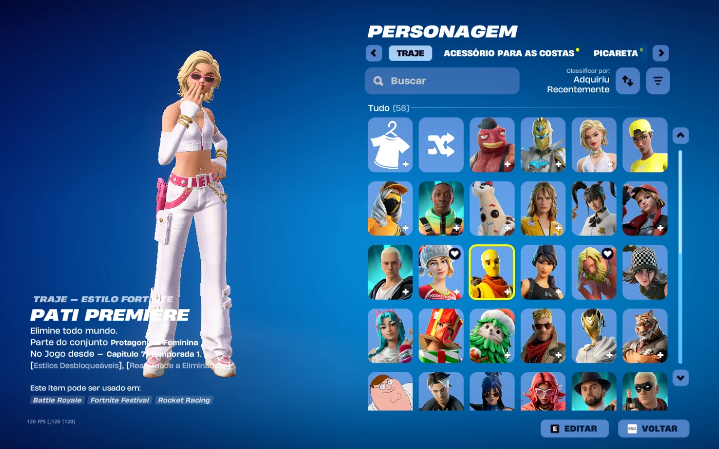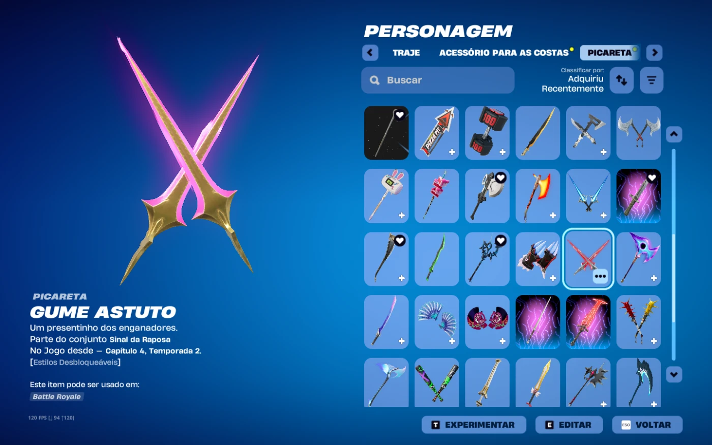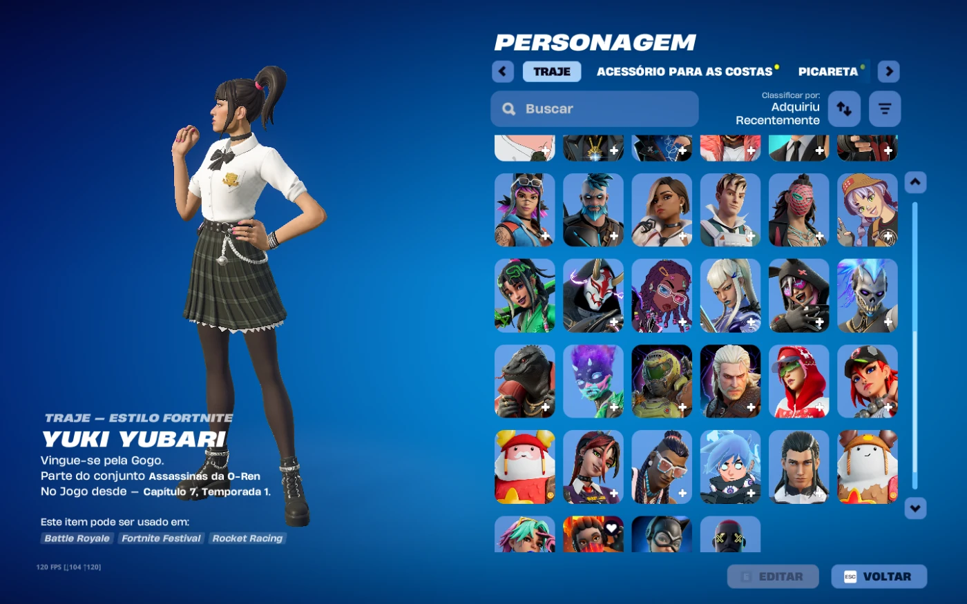 A conta está organizada, com cosméticos desbloqueados e prontos para uso, ideal para quem gosta de ter um inventário sólido, cheio de opções e com progressos garantidos em várias temporadas.