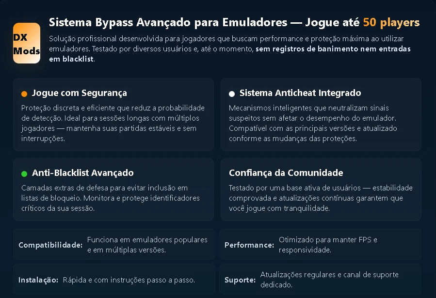 Nosso sistema Bypass Premium permite que você jogue no emulador com até 50 players simultâneos com máxima segurança e estabilidade.
