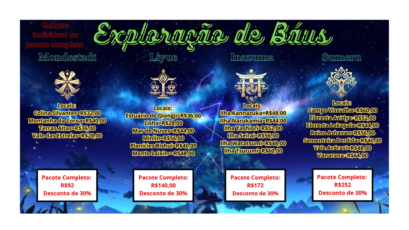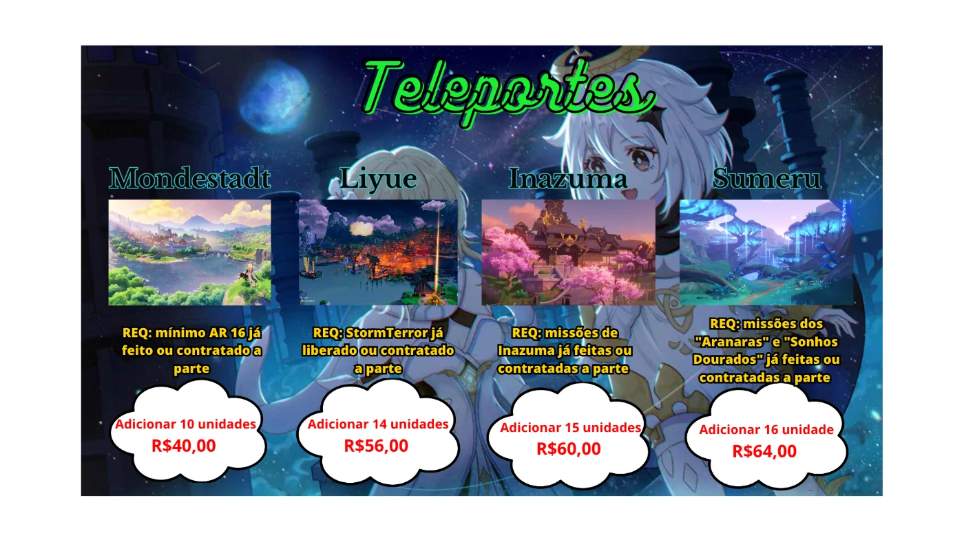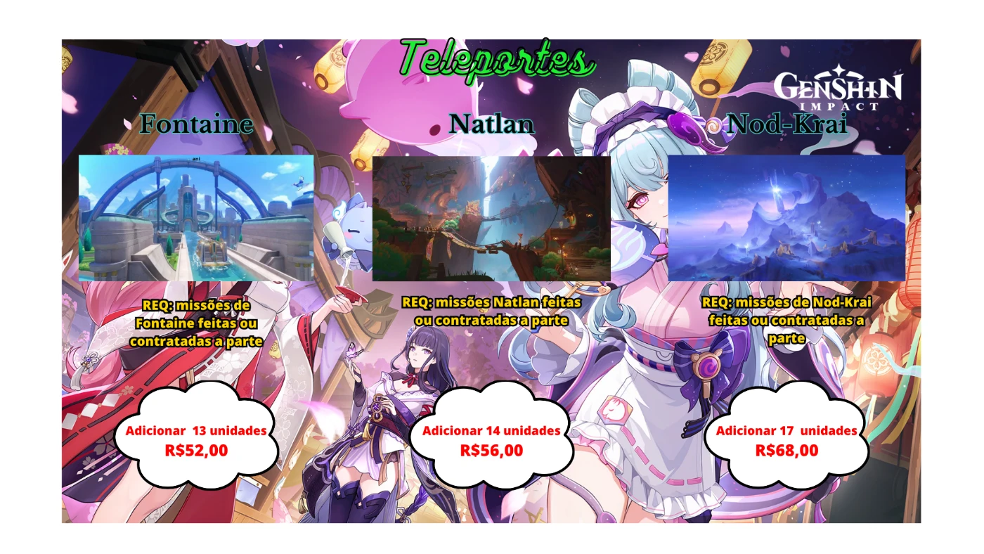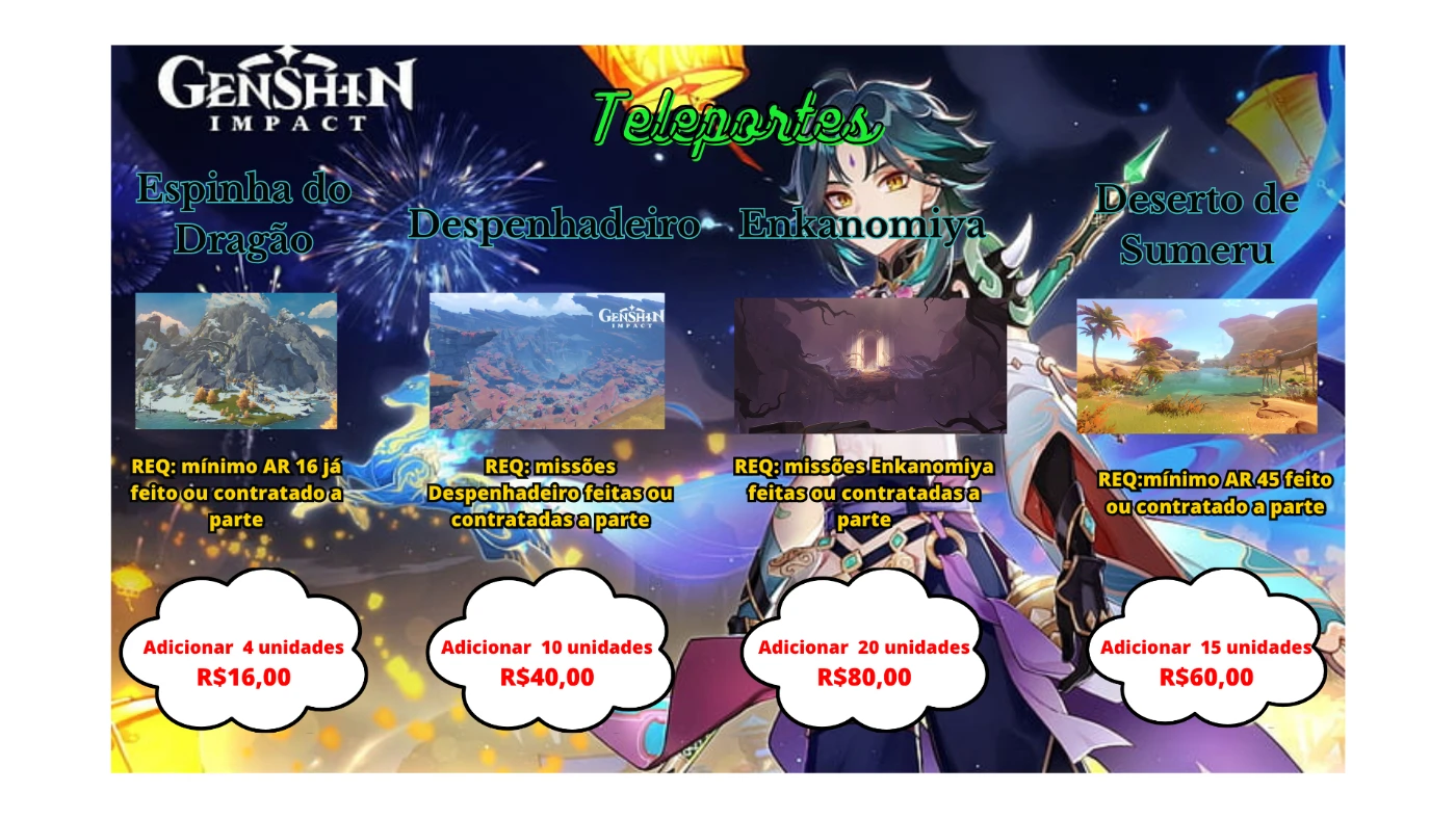 Se precisa otimizar o seu tempo no Genshin, nada melhor do que pagar barato e ter tudo nas suas mão em pouco tempo. Não tenho equipe porém tenho força de vontade e dedicação. Tps, Baús e ate mesmo eventos tudo feito com a maior qualidade possível. Então: