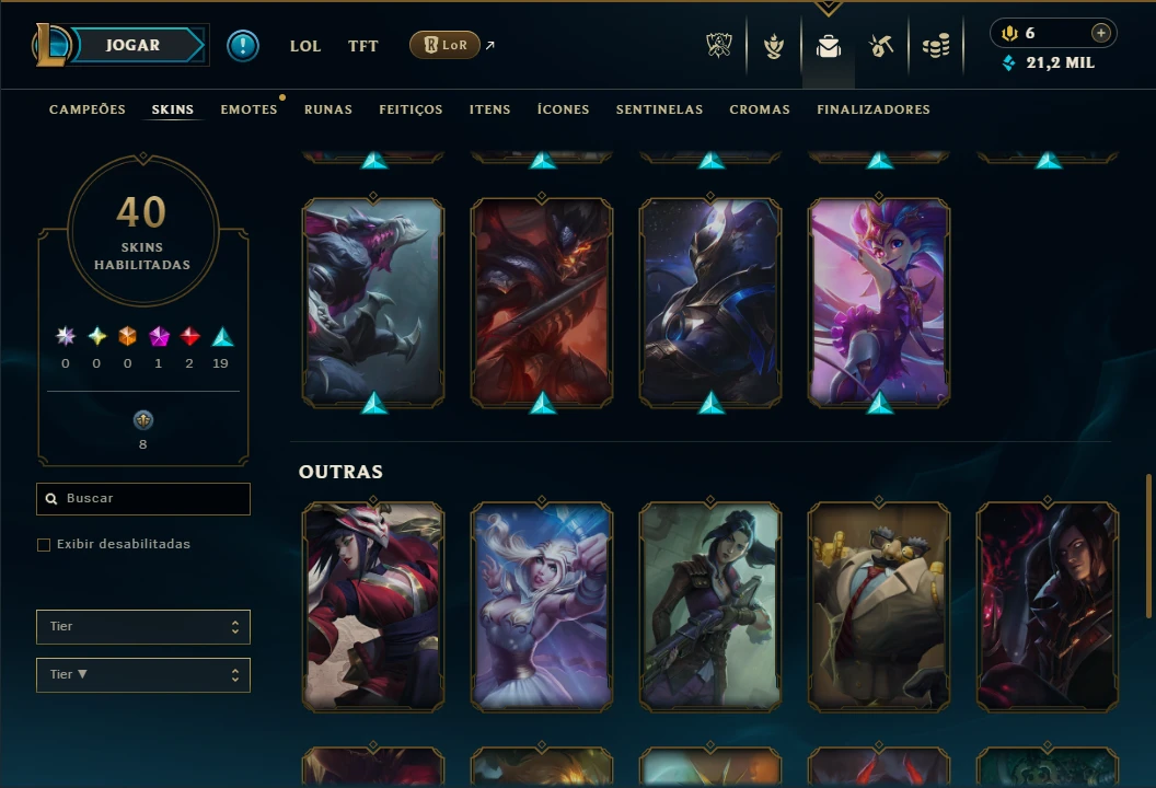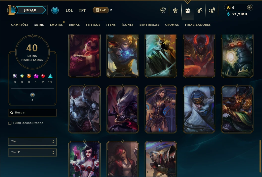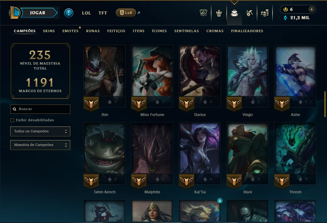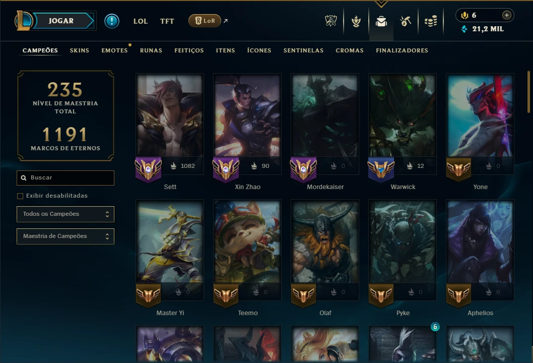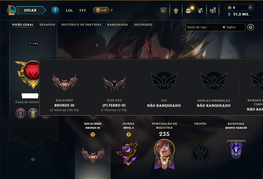 Conta bronze 3 perfeita para smurfar com 75 Champs, Maestria 67 de Sett e 40 Skins, 21k de EA, 2 Cromas, 109 Ícones, 71 Emotes, 1 Fragmento de skin, 13 de campeão, 20 Essencias Miticas, 3 Reembolsos e Honra 4.