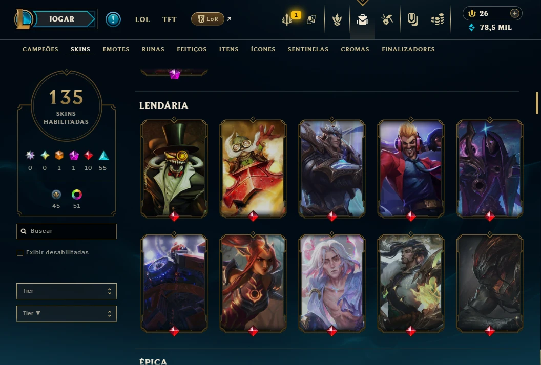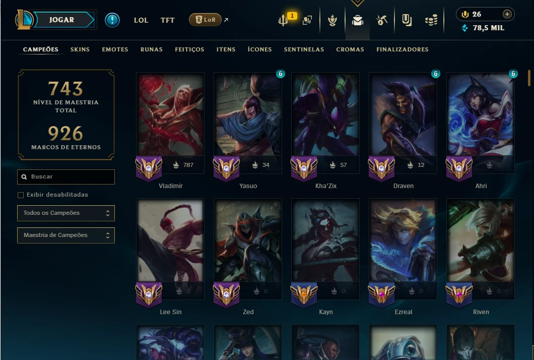 Galera to vendendo minha conta ativa desde 2017 Possuo os dados de recuperação. A conta está atualmente platina 4. A conta tem bastante skins, cromas e eternos. Todos os campeões comprados e +78mil EA. Conta nivel 535. Icones desde 2017. Honra nivel 4.