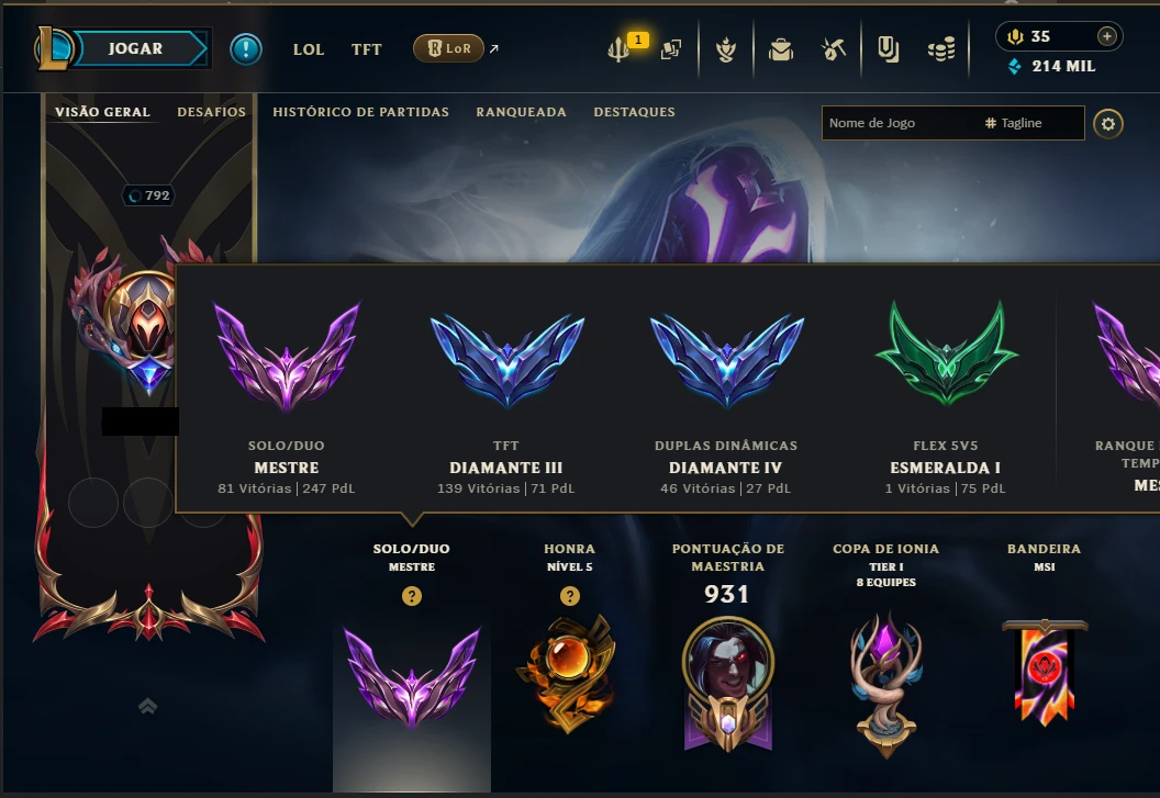 Elo: MESTRE 247PL Nível: 792 Riot Points: 35 Essência Azul: 214 MIL Essência Laranja: 6542 MIL Honra: 5