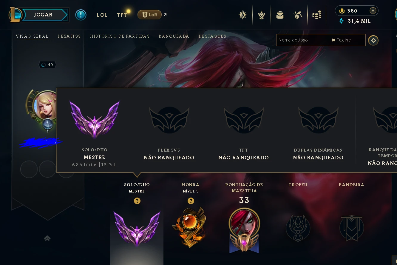 Conta mestre lol 70% de winrate (sem email confirmado)