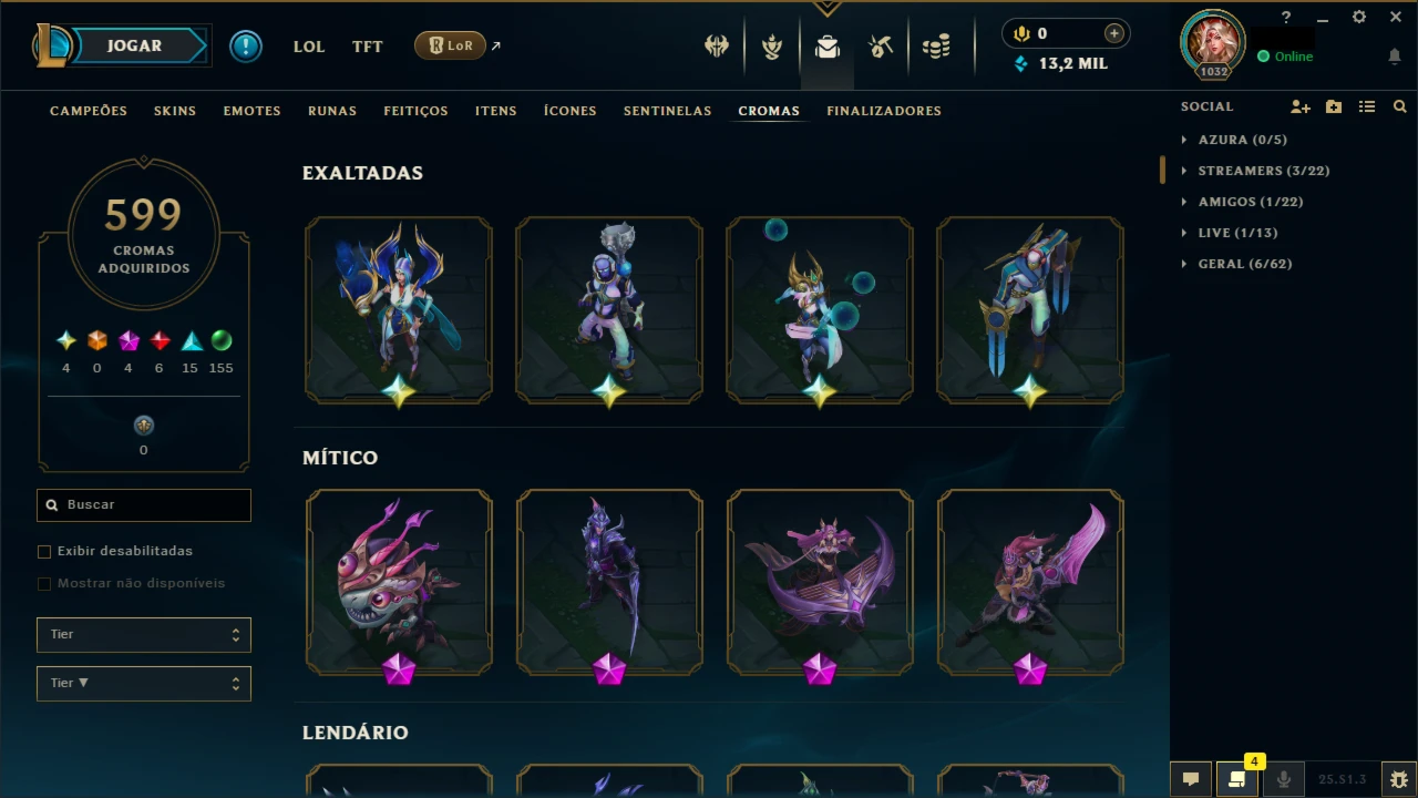 599 - Cromas (4 exaltados, 4 míticos, 6 lendários, 15 épicos e 30 cromas exclusivos da Academia de Piltover);