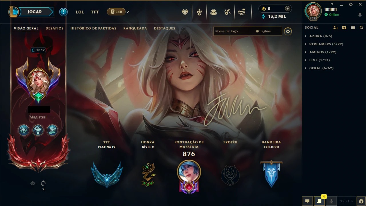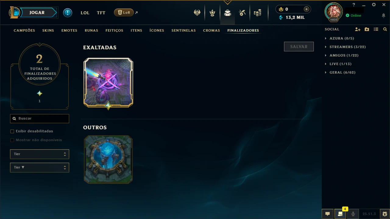 . Conteúdo completo de vários campeões (Seraphine, por exemplo, tem todas as bordas, ícones e cromas limitados, faltando apenas a última skin);