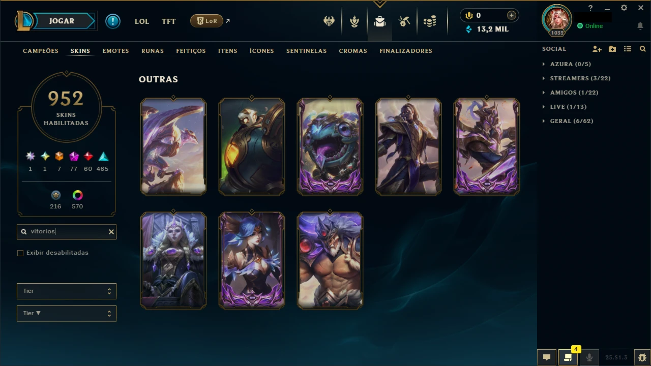 8 - Skins vitoriosas (5 com cromas até o Mestre e as últimas 3 com borda mestre);