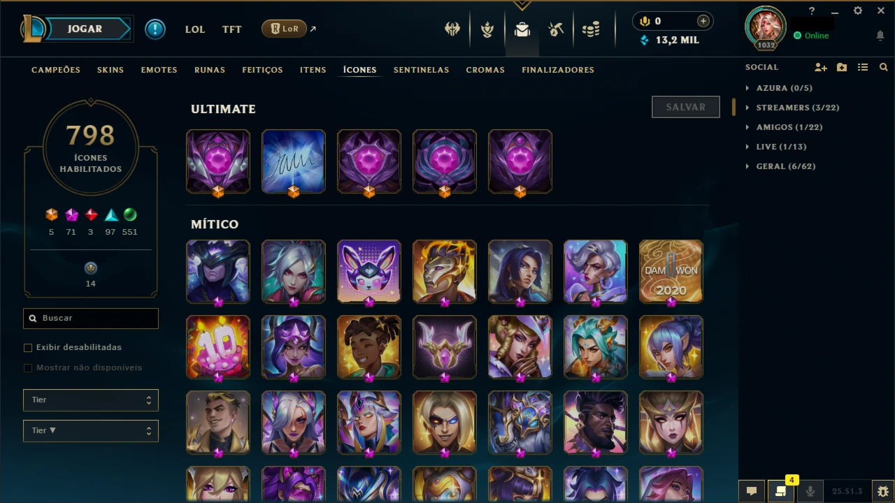 798 - Ícones (Incluindo 5 ultimates: mestres e autógrafo do Faker e 71 ícones míticos);