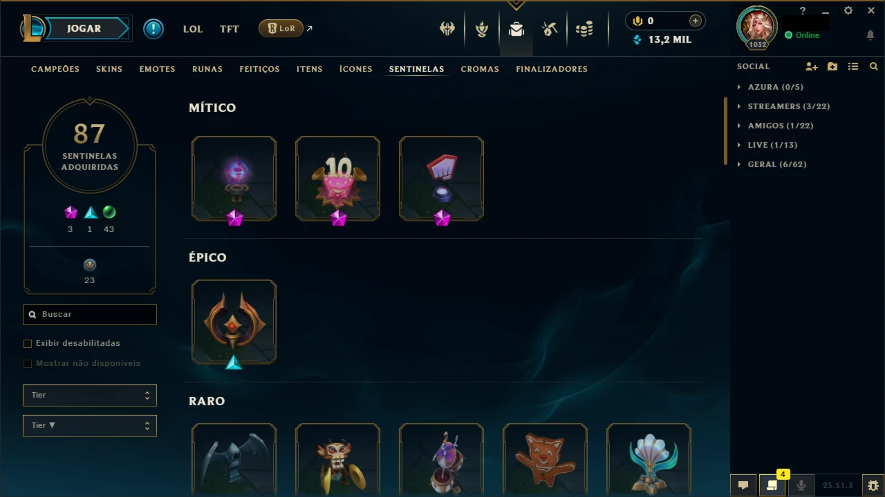 87 - Sentinelas (Incluindo 3 míticas: Punho da RIOT, 10 anos e Arcane Misteriosa);