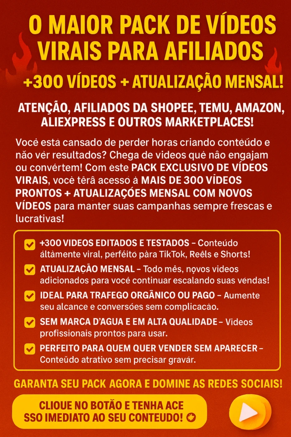🔥 O MAIOR PACK DE VÍDEOS VIRAIS PARA AFILIADOS – +300 VÍDEOS PRONTOS + ATUALIZAÇÃO TODO MÊS! 🔥