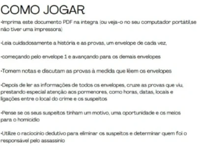 Objetivo: descobrir quem é o assassino, juntando provas e pistas fornecidas no jogo.