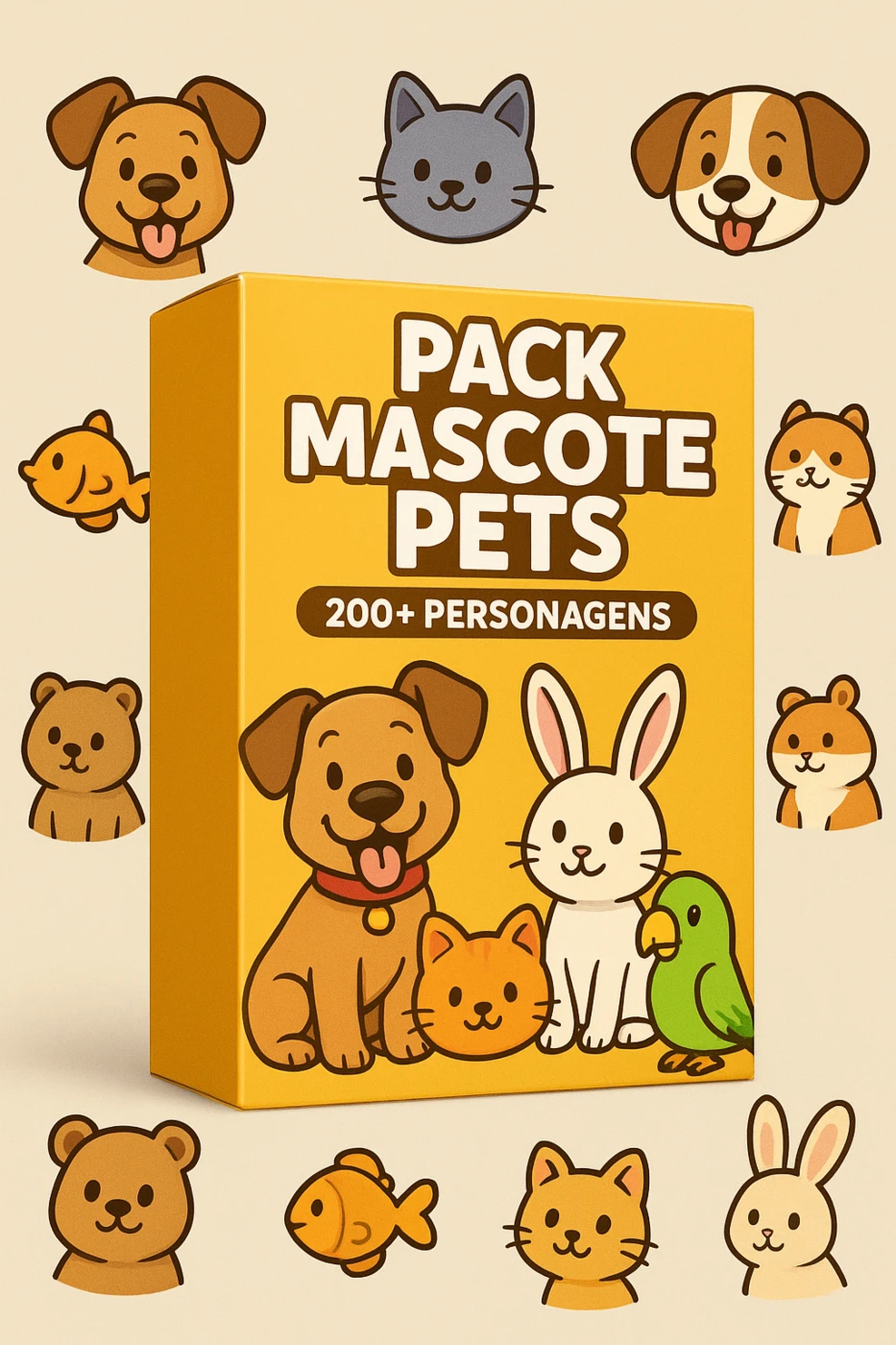 São mais de 200 mascotes exclusivos inspirados em cães, gatos, coelhos, pássaros e diversos animais fofos e carismáticos — perfeitos para criadores de conteúdo, designers, lojistas, adestradores, veterinários ou qualquer apaixonado pelo mundo pet!