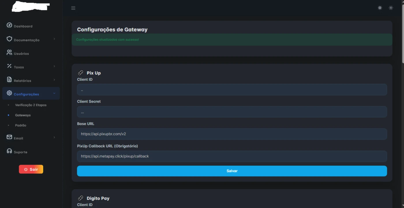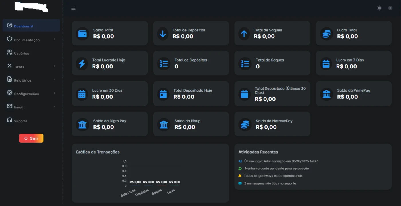 ✅ Gerenciamento de Adquirentes: PrimePAG, DigitoPay, Pixup, Zendry, NotrevePay.