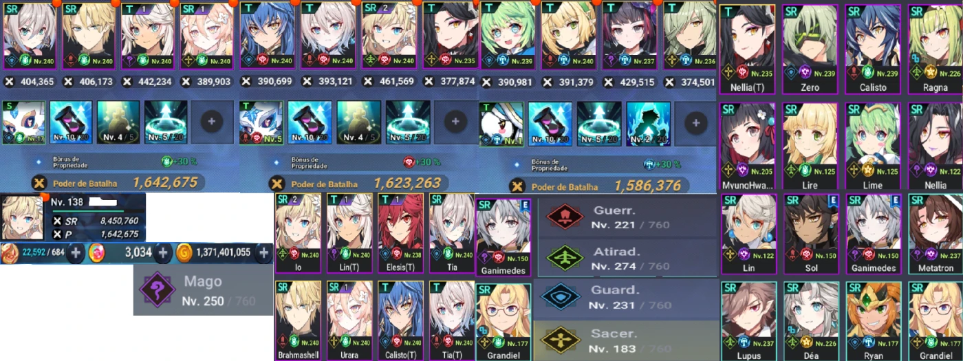 Level: 135 Servidor: Western Io: Possui conjunto de skin O Sorbet Dourado(Muda as skills) Time vida, punição e equilíbrio montados Campanha: Mundo 9(Todos os mapas anteriores ao mundo 9, já foram feitos obtendo as 3 estrelas) Acompanha e-mail e dados do e-mail Forma de login: Google Demais informações nas imagens
