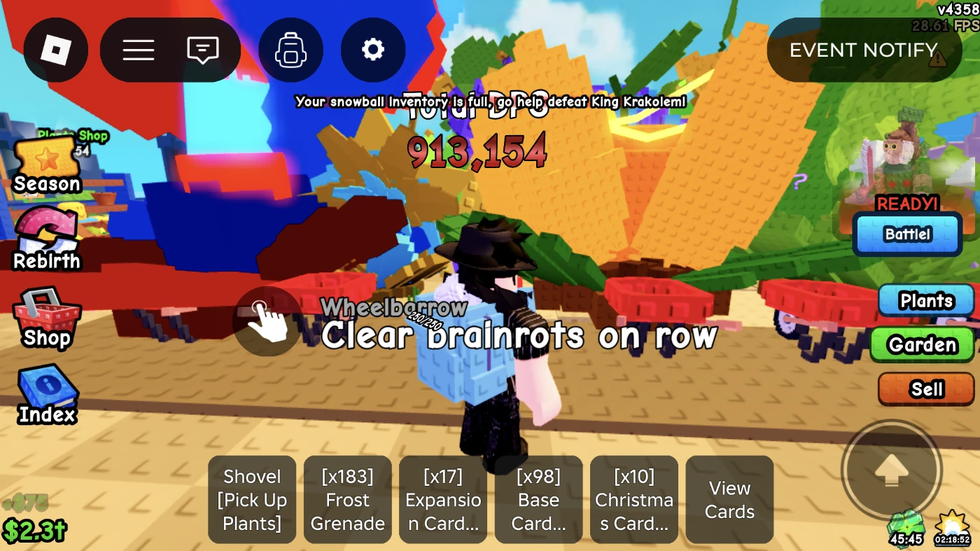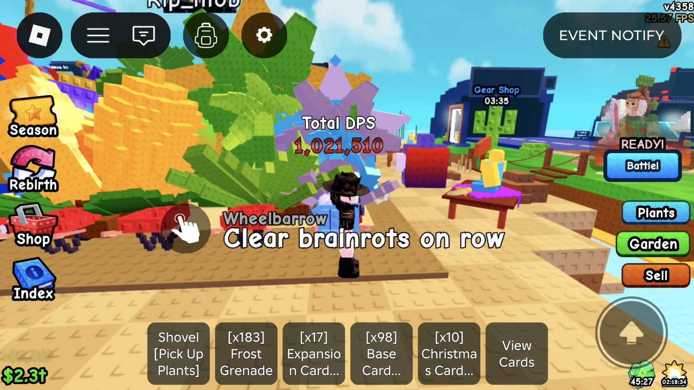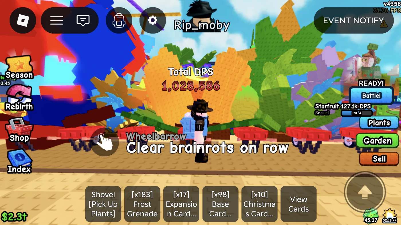 No plantas vs brainots está no rebirth 9 com varias plantas boas tanto no jardim e no inventário, contém carnívora de 10kg e outra de 9kg no inv e outras plantas com mutação como Shroombino, mango, e outros.