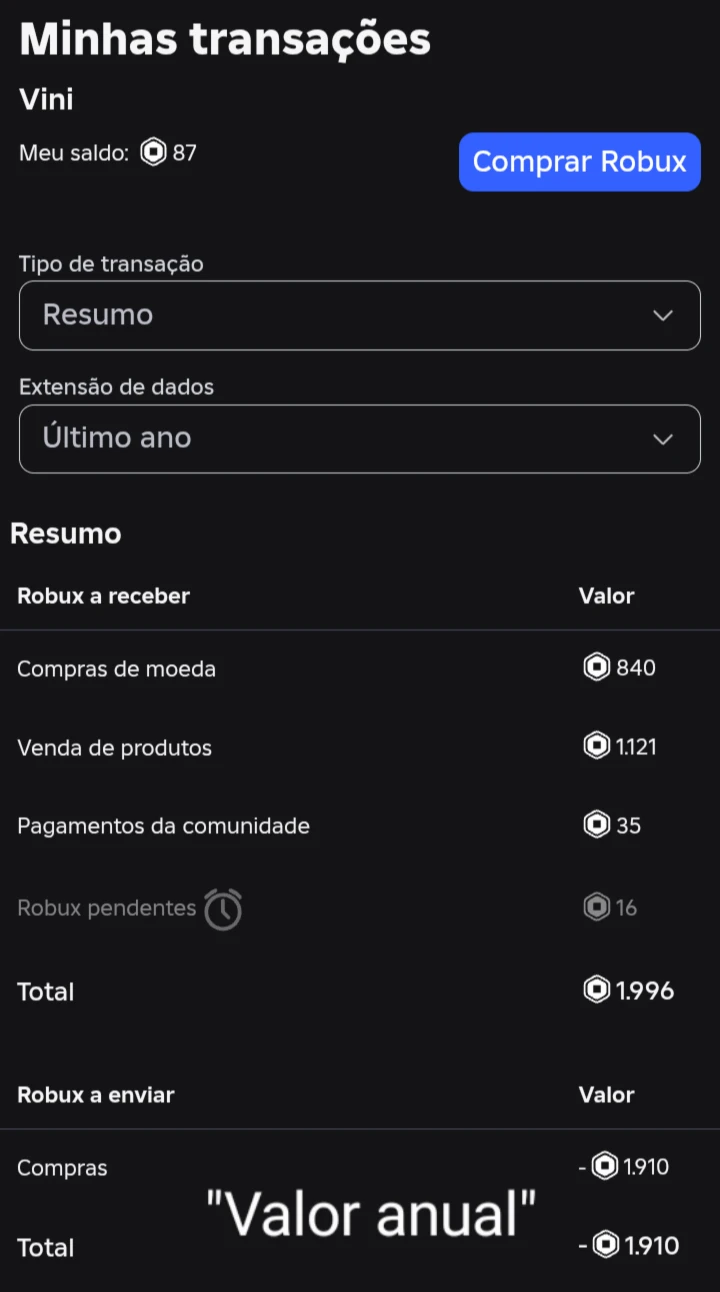 Está conta de roblox é pessoal! Ela tem grupo uma loja que gera um valor aproximadamente de 100 robux por mês! Além do mais ela também possui um grupo que também gera um valor considerável mensalmente! A conta tem várias skins e várias coisas no jogo "Blox fruits". Possuindo soul guitar, cdk, ttk, frutas, mini Yoru, todos os hakis lendários e o título "Hakaishin". A conta do blox fruits também possui gamepass, sendo elas ice permanente, 2 slots, e 2× mestria. Conta lvl 2200! A conta tem 100 robux disponível, e mais alguns pendentes!