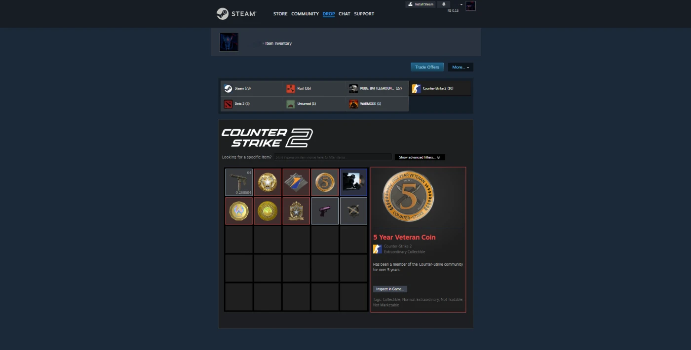 Rust com Struments Packs e artick pack comprados fora os vários itens do twitch drops ao todo 35 itens.