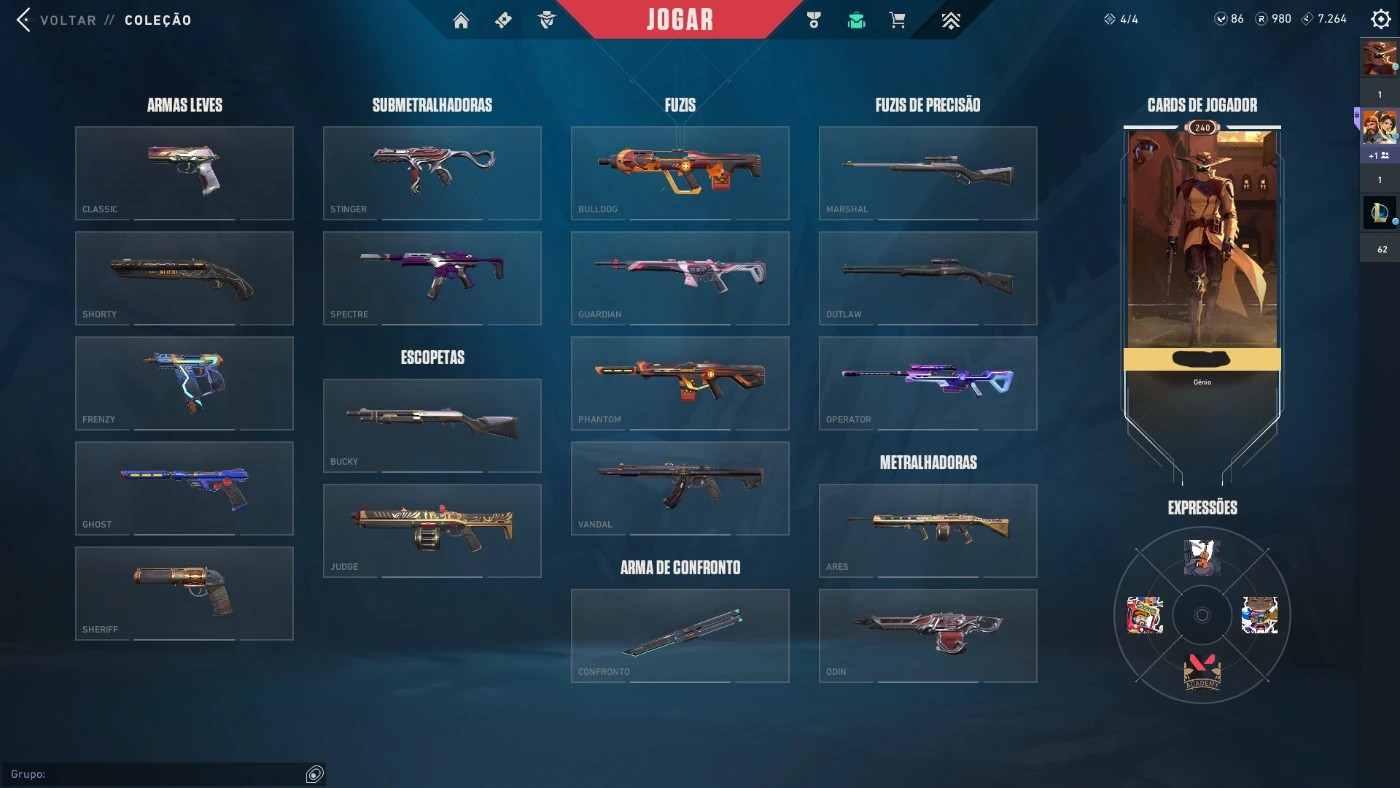 Conta nível 240 Bronze 2, max rank Diamante 1. Todos os agentes estão liberados, inclusive o Veto, e há skins em todas as armas,menos na Outlaw.