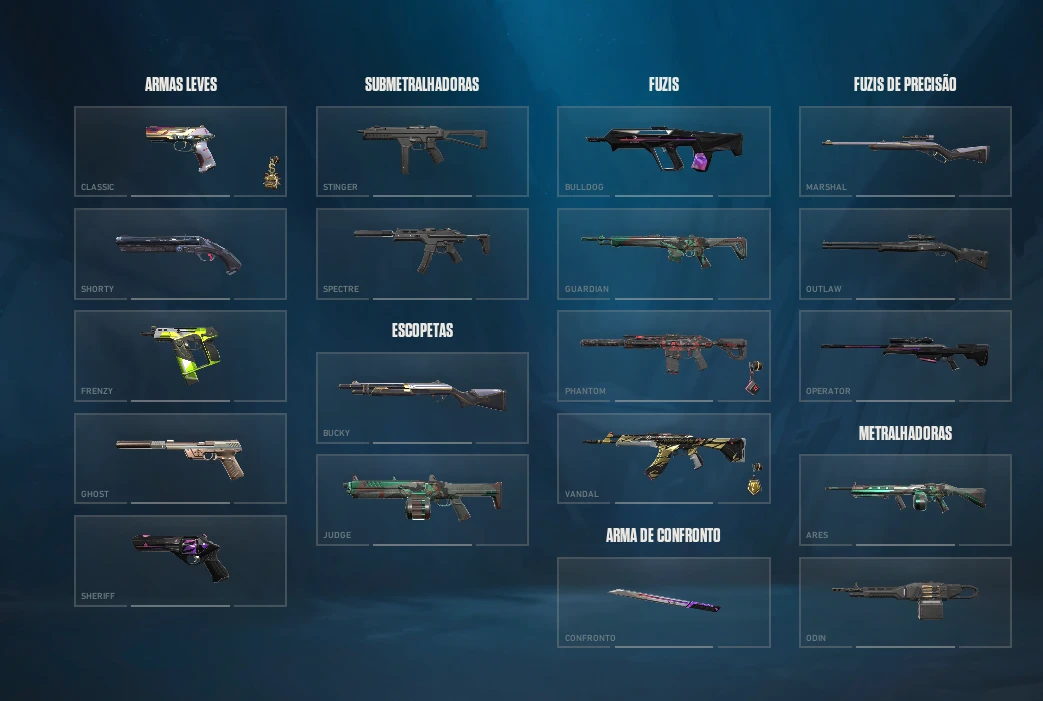 • Diversas skins de Passe de Batalha de temporadas anteriores, incluindo armas com variantes e cards exclusivos.
