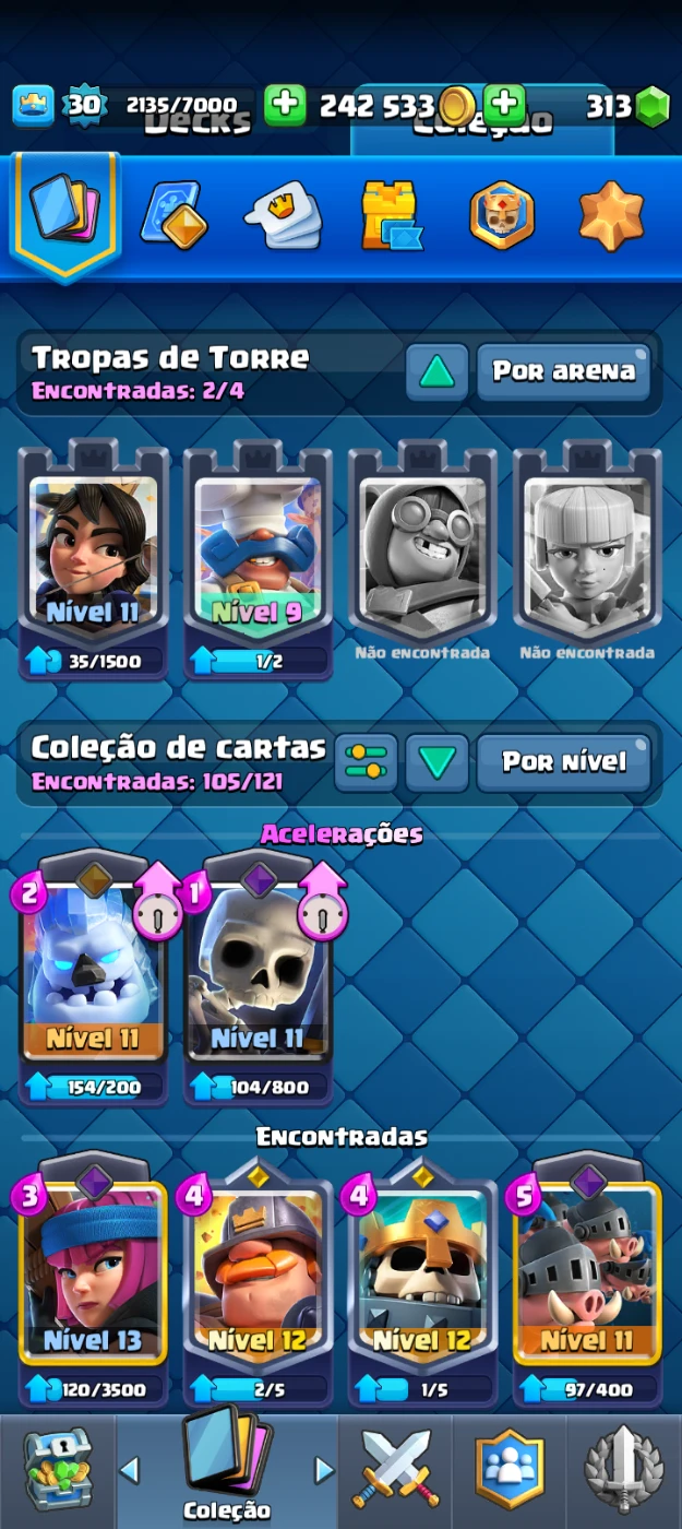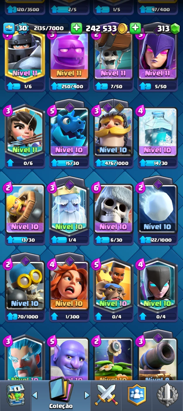 Destaques: megacavaleiro nível 11, pirotécnica nível 13, rei esqueletos e mineiro bombado nível 12
