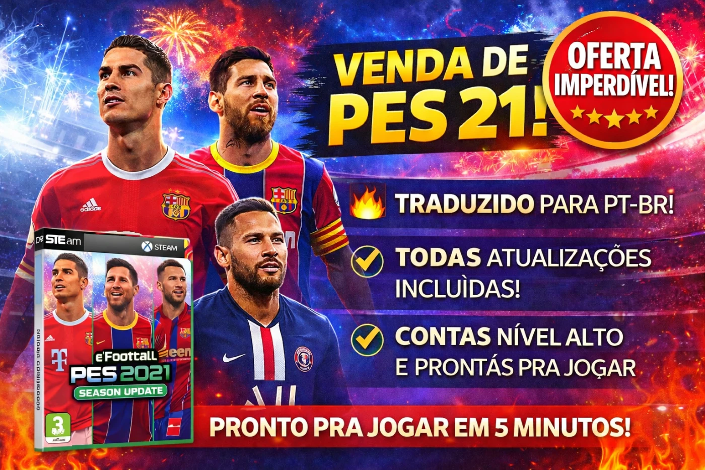 Na LC Vendas, você encontra o PES 2021 totalmente traduzido para PT-BR, com todas as atualizações, pronto para rodar no PC e garantir a melhor experiência no futebol virtual.