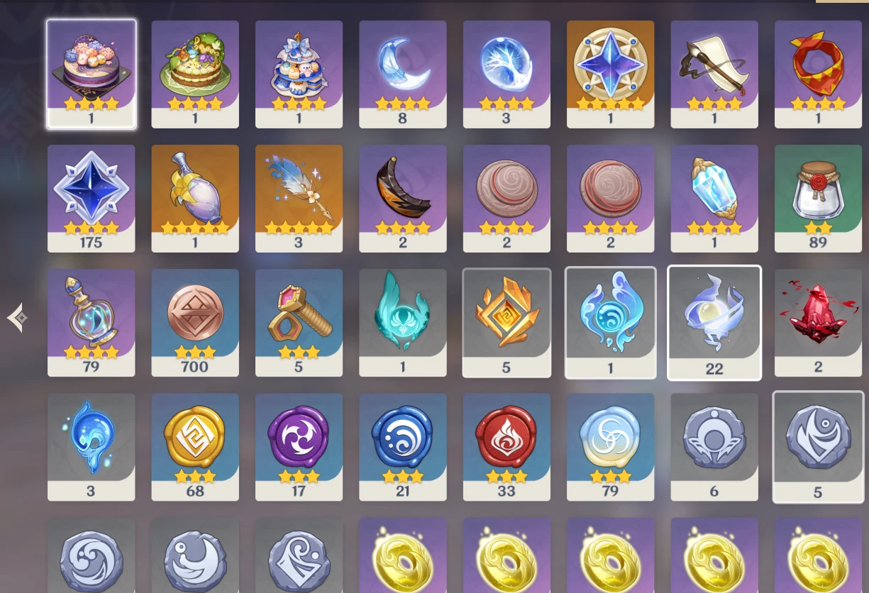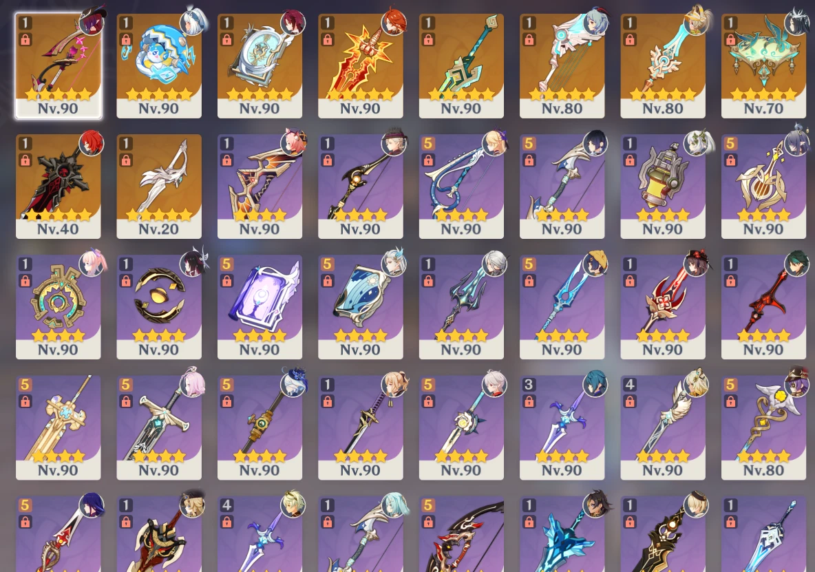 Diversos outros personagens 5⭐ e armas 5⭐ que completam uma conta versátil para qualquer composição de time.
