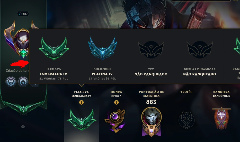 De 3 a 5 skins vitoriosas (não joguei todos os anos) Elo entre esmeralda e platina, nunca foi banida, apenas restrições de chat's