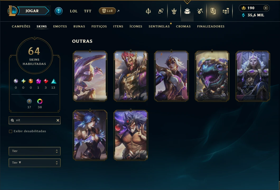 Conta Mestre com 208 PDL, TODOS os Champs, 20 Maestrias acima de 7, 64 Skins, 7 Vitoriosas, 35k de EA, 39 Cromas, 158 Ícones, 141 Emotes, 215 Fragmentos de campeão, 21 Fragmentos de campeão, 63 Essencias Miticas, 3 Reembolsos e Honra 4.