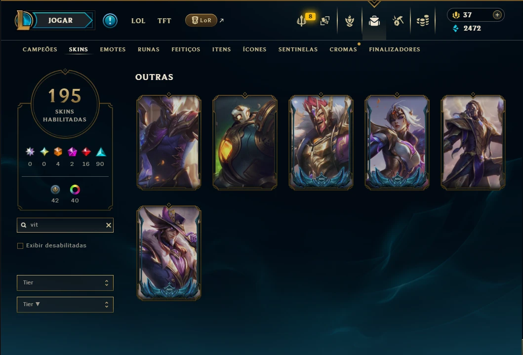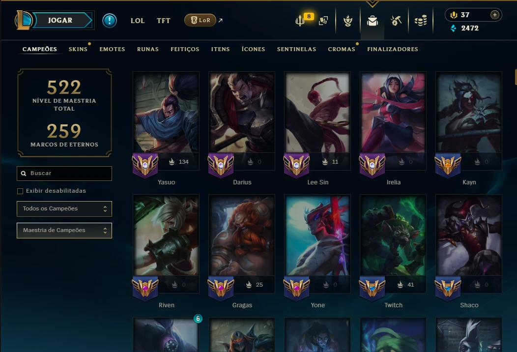( JG / MID / TOP ) - ( Nivel 437 ) - Conta Prata 1 com TODOS os Champs, Maestria 18 de Yasuo, 13 de Darius, 13 de Lee, 11 Maestrias acima de 7, 195 Skins, 4 Ultimates, 2 Miticas, 6 Vitoriosas, 41 Cromas, 321 Ícones, 197 Emotes, 22 Essencias Miticas, 1 Reembolso e Honra 5.