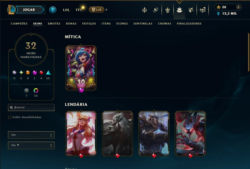 Conta prata 4 com 65 Champs e 32 Skins, 12k de EA, 21 Cromas, 92 Ícones, 31 Emotes, 1 Fragmento de skin, 3 Reembolsos e Honra 5.